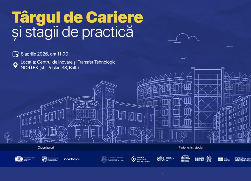 Universitatea de Stat „Alecu Russo” din Bălți vă invită să participați la unul dintre cele mai importante evenimente dedicate dezvoltării profesionale a tinerilor – Târgul de Cariere și Stagii de Practică, ediția 2026.